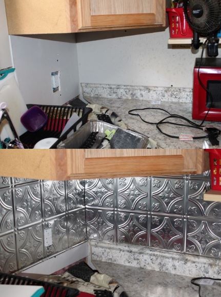 With the old trailer, I wasn’t willing to go all-out on cosmetics. So the kitchen backsplash needed to be both frugal and practical for me to do with a toddler underfoot. I’m not an Amazon affiliate (although I should be… I spend enough of my own money there…), but I’ll go ahead and name-drop. Through browsing and other DIY blogs I found Facade vinyl tin-look ceiling and wall tiles. Excited, I got 2 sheets of their cheapest-per-foot, white, traditional farmhouse print. I hung one above/behind the oven. I like the vinyl, I really do, but further reading made me discount it as the counter’s backsplash because I own a countertop basket fryer. That kind of close heat would hurt the vinyl. More Amazon browsing and reviews led me to Metal Ceiling Express, which has a thin, real tin version of the very same pattern Facade did in vinyl.